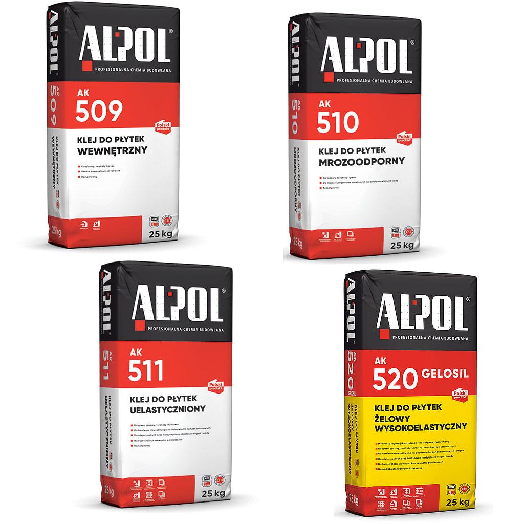 Alpol AK 509: Klej do płytek wewnętrznych klasy C1T, przeznaczony do płytek glazurowanych, terakotowych i gresowych wewnątrz budynków.